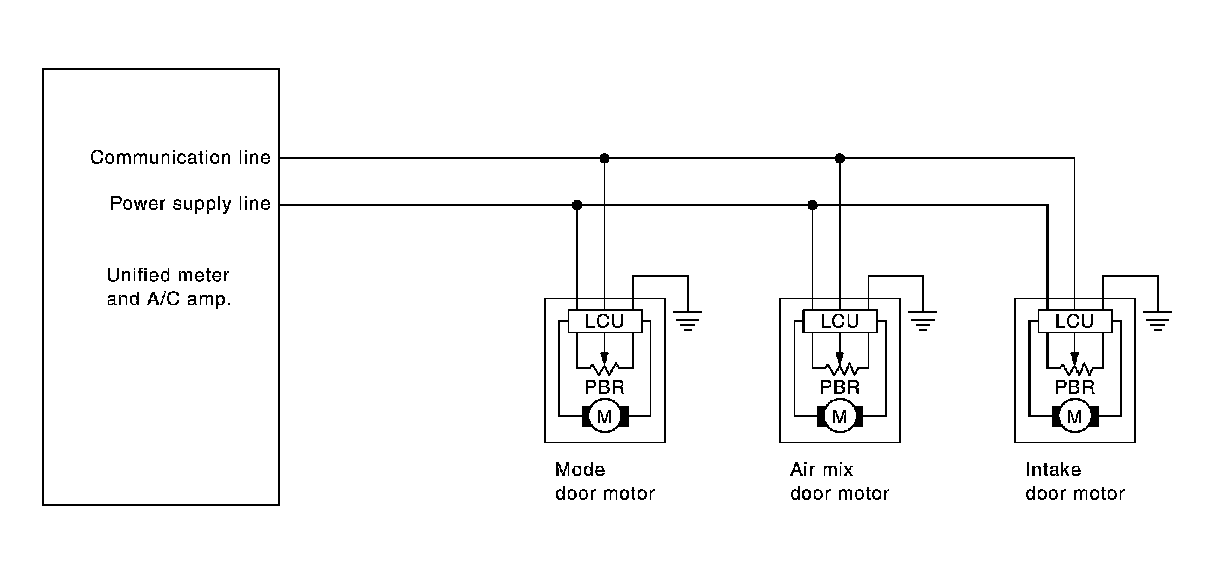 - The air mix door motors, mode door motor and intake door motor read their respective signals according to the address signal. Opening angle indication signals received from the unified meter and A/C amp. and each of the motor position sensors are compared by the LCUs in each door motor with the existing decision and opening angles. Subsequently, HOT/COLD, DEF/VENT and FRE/REC operation is selected. The new selection data are returned to the unified meter and A/C amp.