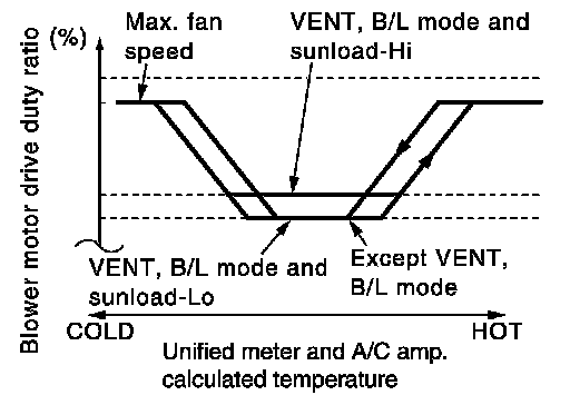 Fan speed is automatically controlled by the temperature setting, ambient temperature, in-vehicle temperature, intake temperature, amount of sunload and air mix door position.
