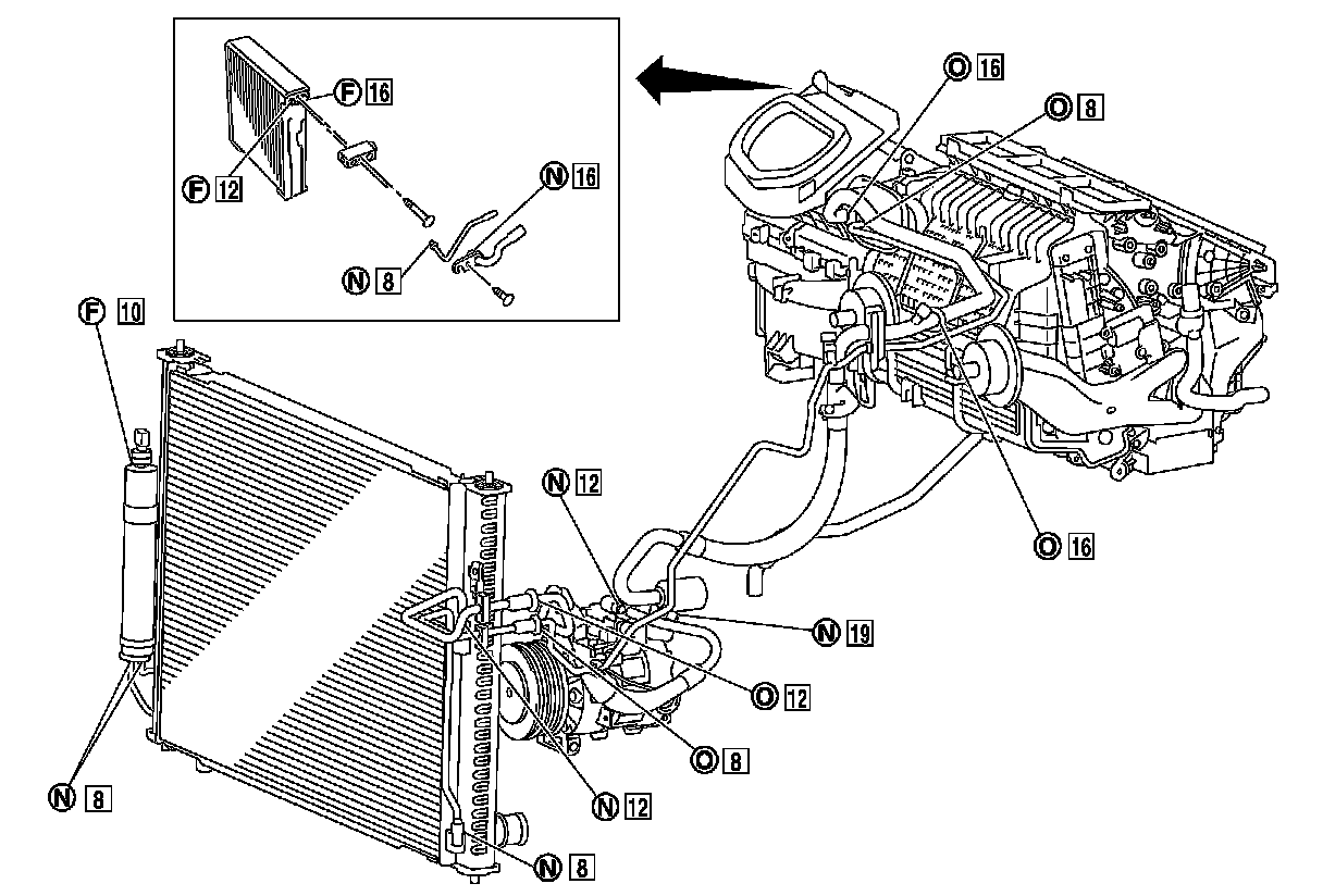 Disconnect that line and replace the O-ring when the refrigerant leaking point is found. Then tighten connections of seal seat to the specified torque.