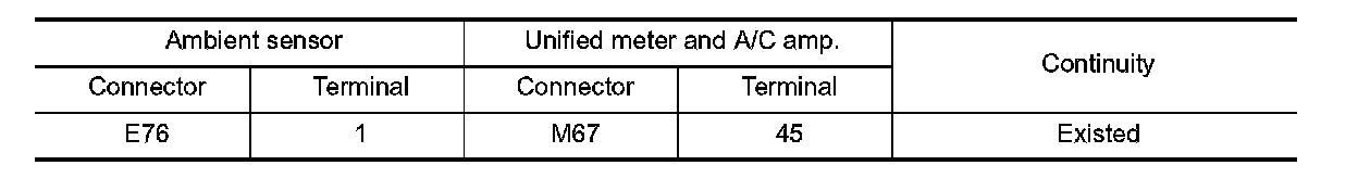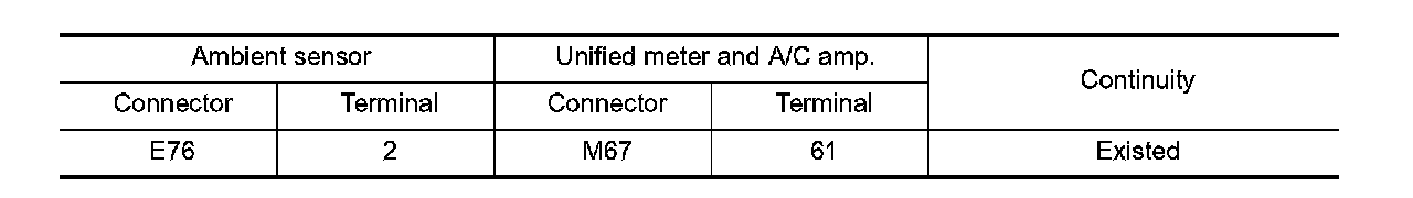 3. Check continuity between ambient sensor harness connector and unified meter and A/C amp. harness connector.