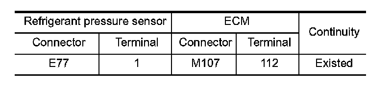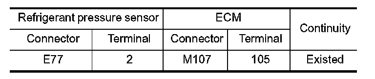 1. Check the continuity between refrigerant pressure sensor harness connector and ECM harness connector.