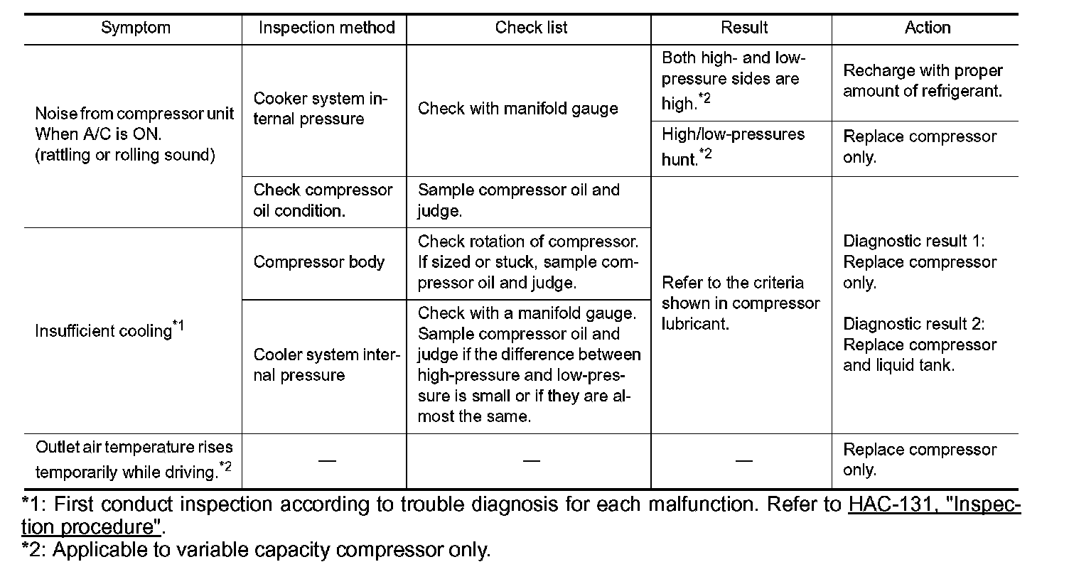 Follow the next table and perform trouble diagnosis if there is a compressor unit malfunction (internal noise, insufficient cooling).