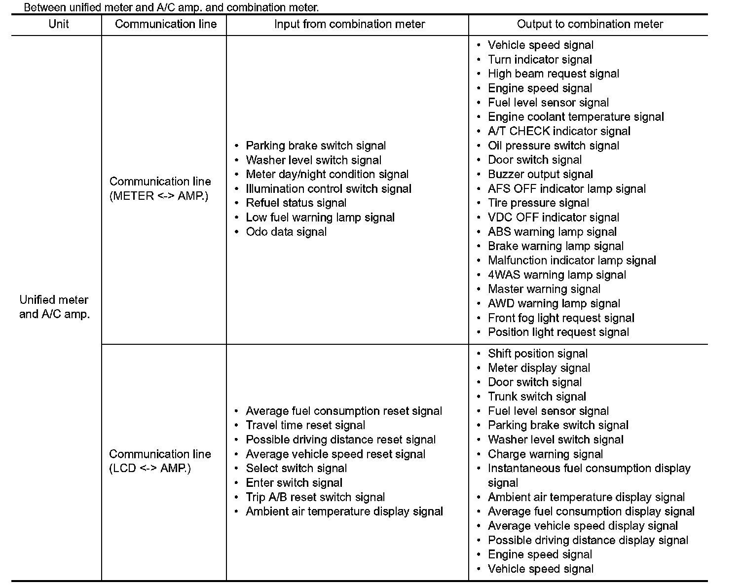 - The combination meter retrieves the information required for controlling the operations of the meters, indicator lamps/warning lamps and information display from the communication signals from the unified meter and