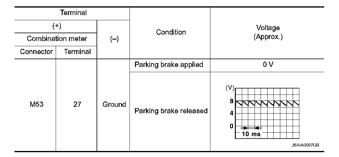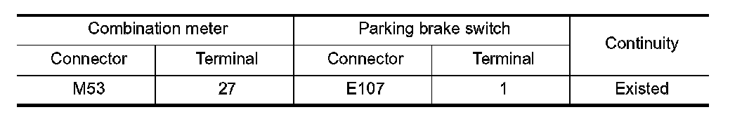 3. Check continuity between combination meter harness connector terminal and parking brake switch harness connector terminal.