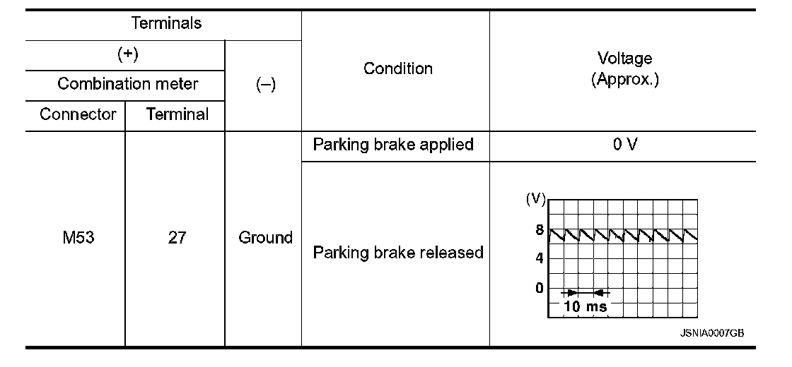 3. Check continuity between combination meter harness connector terminal and parking brake switch harness connector terminal.
