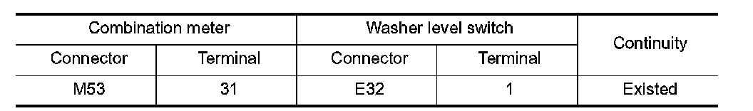 3. Check continuity between combination meter harness connector terminal and washer level switch harness connector terminal.