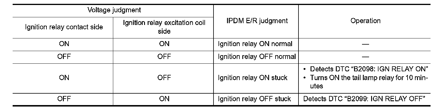 - IPDM E/R judges the ignition relay error if the voltage differs between the contact circuit and the excitation coil circuit.