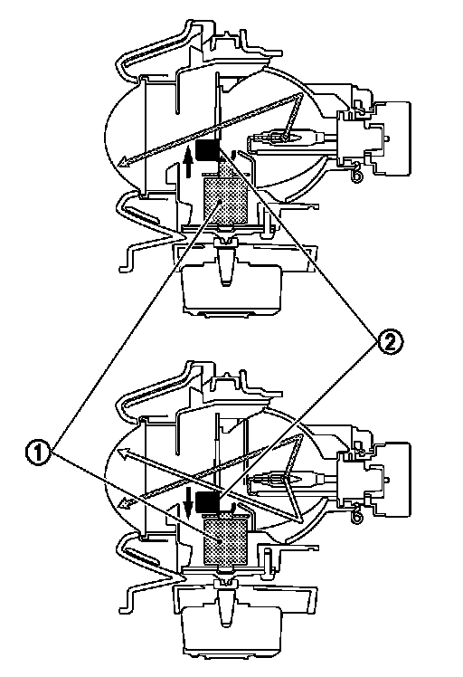 - When the headlamp high relay is turned ON, magnetic force is applied to the high beam solenoid (1) by a current. The mobile valve shade (2) is switched to the high beam position.