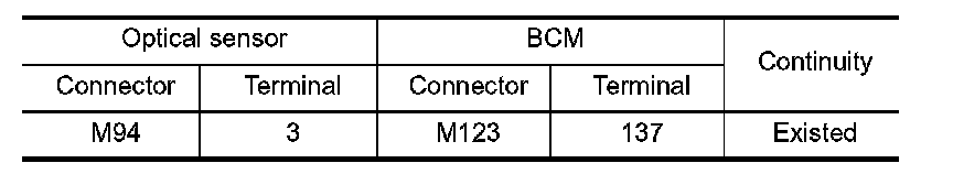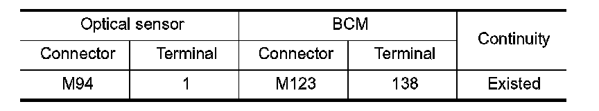 3. Check continuity between the optical sensor harness connector and the BCM harness connector.