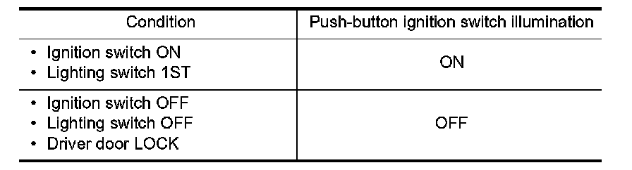 2. With operating the lighting switch, check that the push-button ignition switch illumination turns ON/OFF