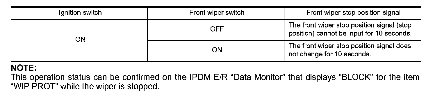 When a front wiper stop position signal is in the conditions listed below, IPDM E/R stops power supply to wiper after repeating a front wiper 10 seconds activation and 20 seconds stop five times.