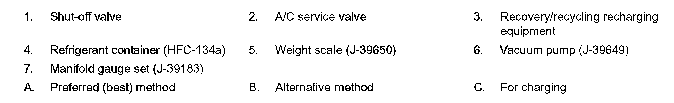 Remove HFC-134a (R-134a) from A/C system using certified service equipment meeting requirements of SAE J-2210 [HFC-134a (R-134a) recycling equipment] or J-2209 [HFC-134a (R-134a) recovery equipment]. Ventilate work area before resuming service if accidental system discharge occurs. Additional health and safety information may be obtained from refrigerant and lubricant manufacturers.