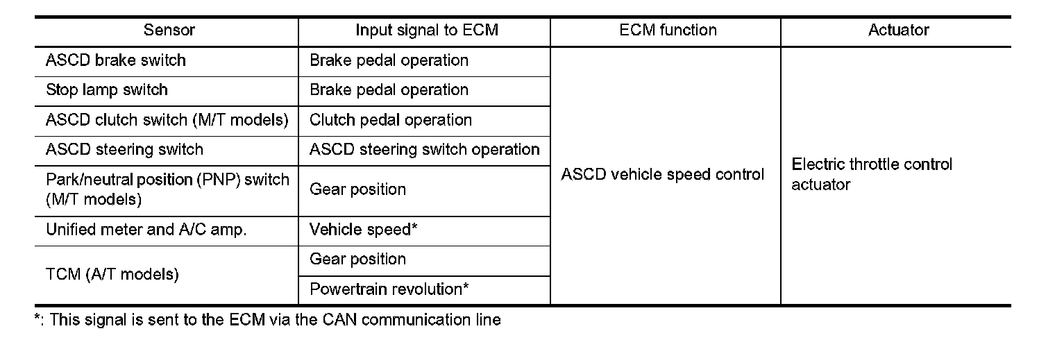 Operation status of ASCD is indicated by CRUISE indicator and SET indicator in combination meter. If any malfunction occurs in the ASCD system, it automatically deactivates control.