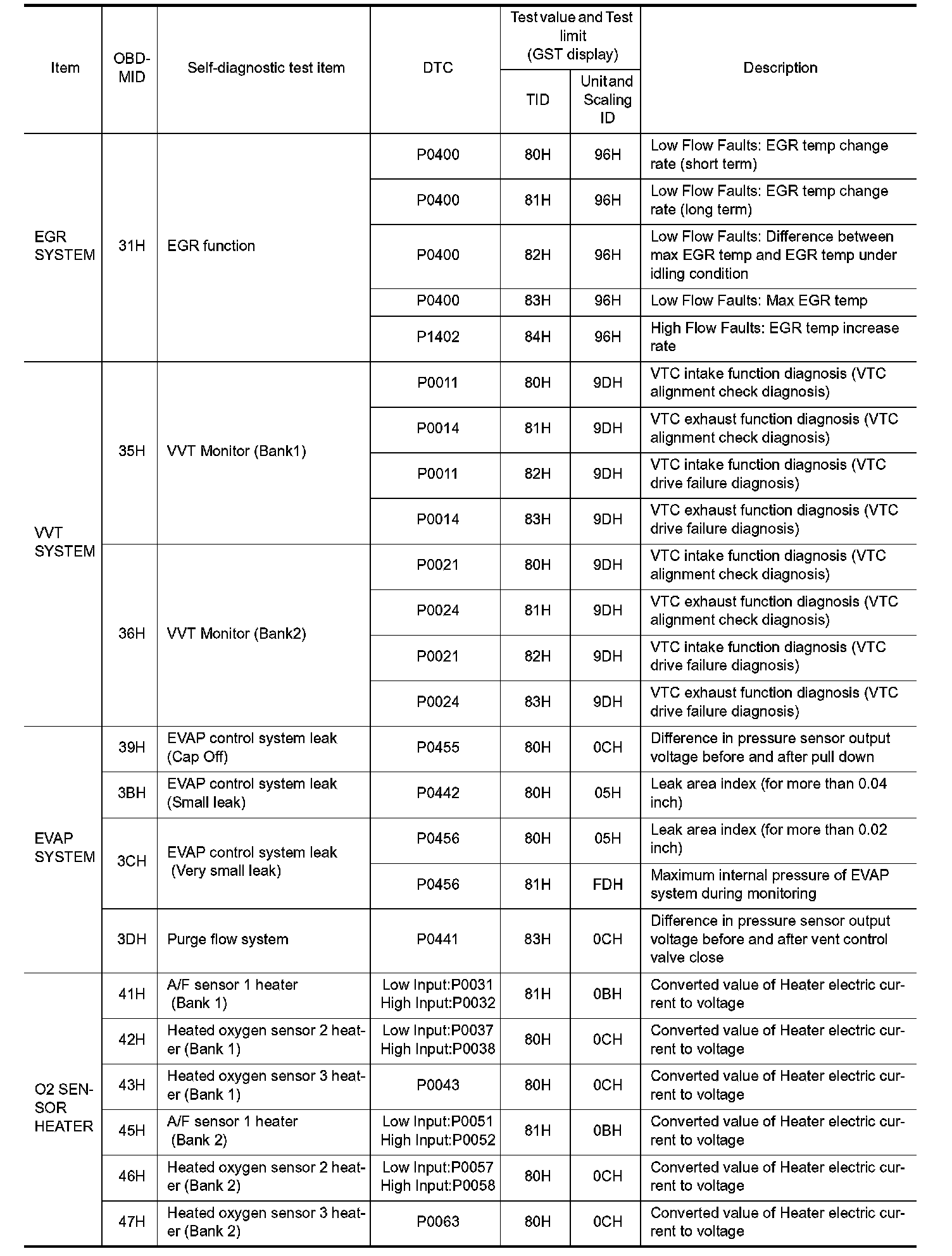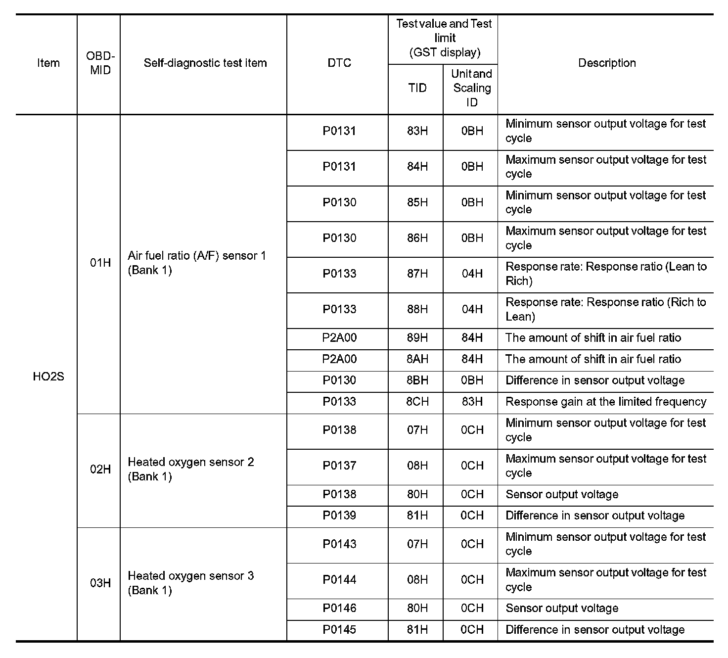 The items of the test value and test limit will be displayed with GST screen which items are provided by the ECM. (eg., if bank 2 is not applied on this vehicle, only the items of bank 1 are displayed)