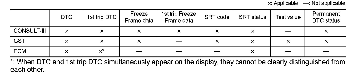 For malfunctions in which 1st trip DTCs are displayed, refer to "EMISSION-RELATED DIAGNOSTIC INFORMATION ITEMS". These items are required by legal regulations to continuously monitor the system/component. In addition, the items monitored non-continuously are also displayed on CONSULT-III.