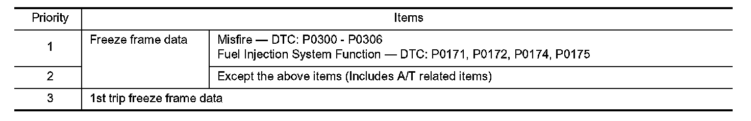 For example, the EGR malfunction (Priority: 2) was detected and the freeze frame data was saved in the 2nd trip. After that when the misfire (Priority: 1) is detected in another trip, the freeze frame data will be updated from the EGR malfunction to the misfire. The 1st trip freeze frame data is updated each time a different malfunction is detected. There is no priority for 1st trip freeze frame data. However, once freeze frame data is stored in the ECM memory, 1st trip freeze data is no longer stored (because only one freeze frame data or 1st trip freeze frame data can be stored in the ECM). If freeze frame data is stored in the ECM memory and freeze frame data with the same priority occurs later, the first (original) freeze frame data remains unchanged in the ECM memory.