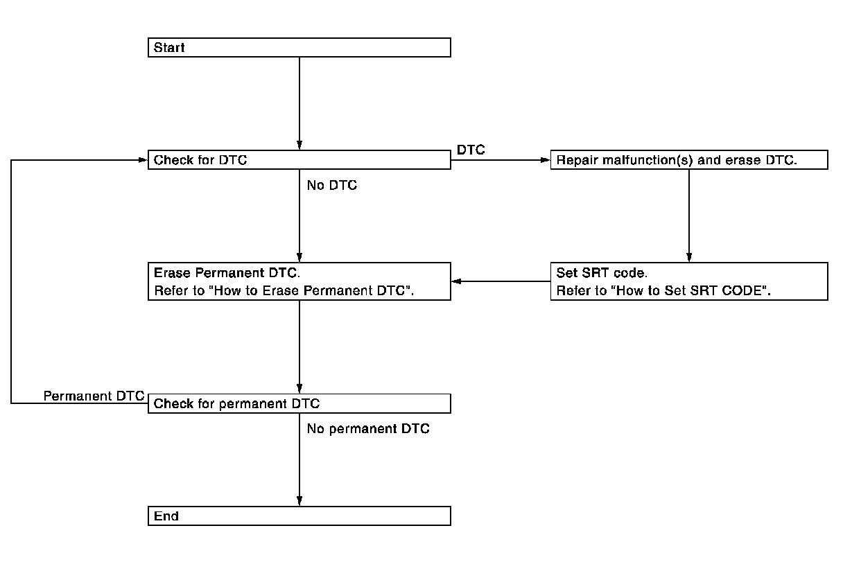 If permanent DTC is stored or MIL is illuminates during the state emissions inspection, the vehicle is also returned to the customer untested even though the SRT indicates "CMPLT" for all test items. Therefore, it is important to check SRT ("CMPLT"), DTC (No DTCs) and permanent DTC (No permanent DTCs) before the inspection.
