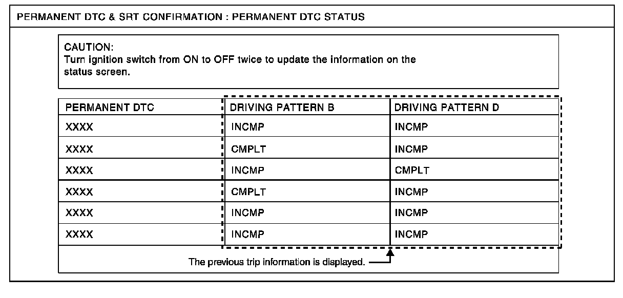 Permanent DTCs stored in ECM memory are displayed on the CONSULT-III screen to show if a driving pattern required for erasing permanent DTCs is complete (CMPLT) or incomplete (INCMP).