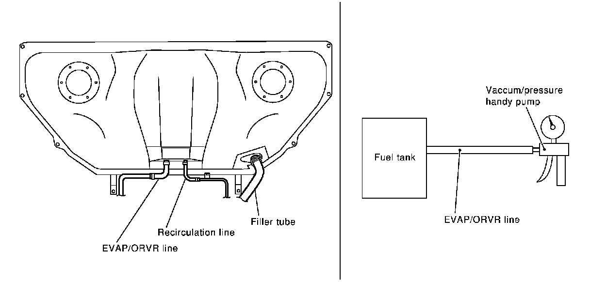 Apply vacuum pressure to hose end [-13.3 kPa (-0.136 kg/cm3, -1.93 psi)] with fuel gauge retainer remaining open and check that the pressure is applicable.