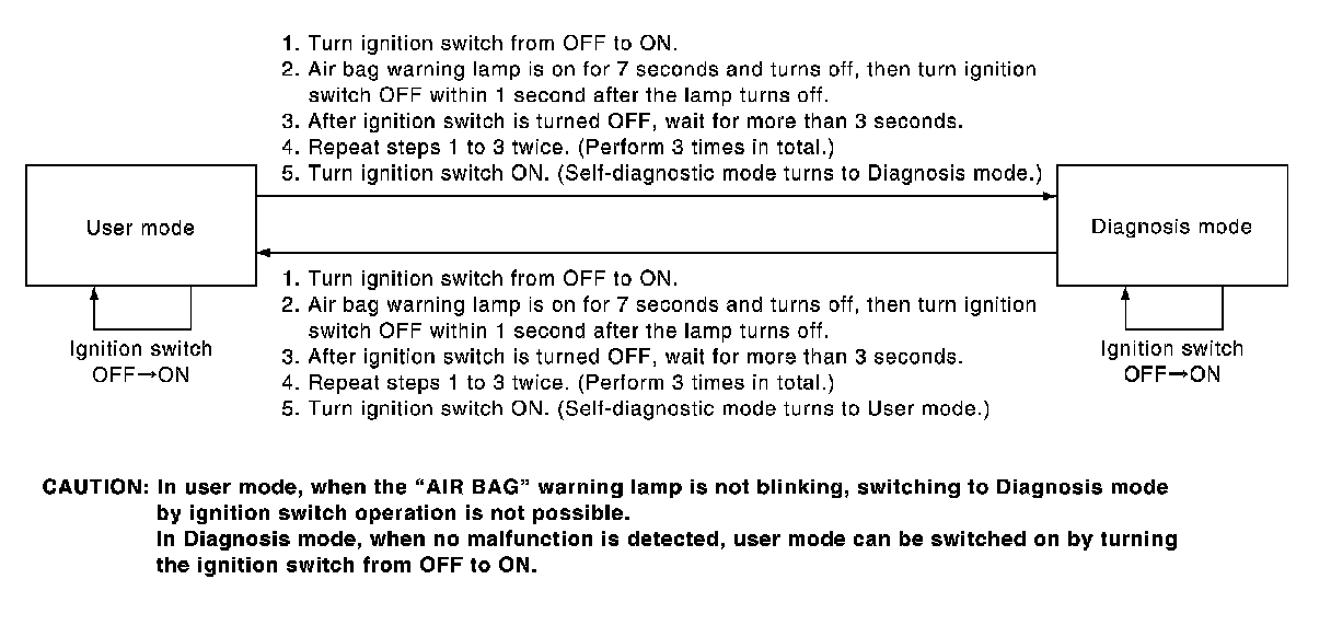 - After a malfunction is repaired, turn ignition switch ON. Diagnosis mode returns to the user mode. At that time, the self-diagnosis result is cleared.