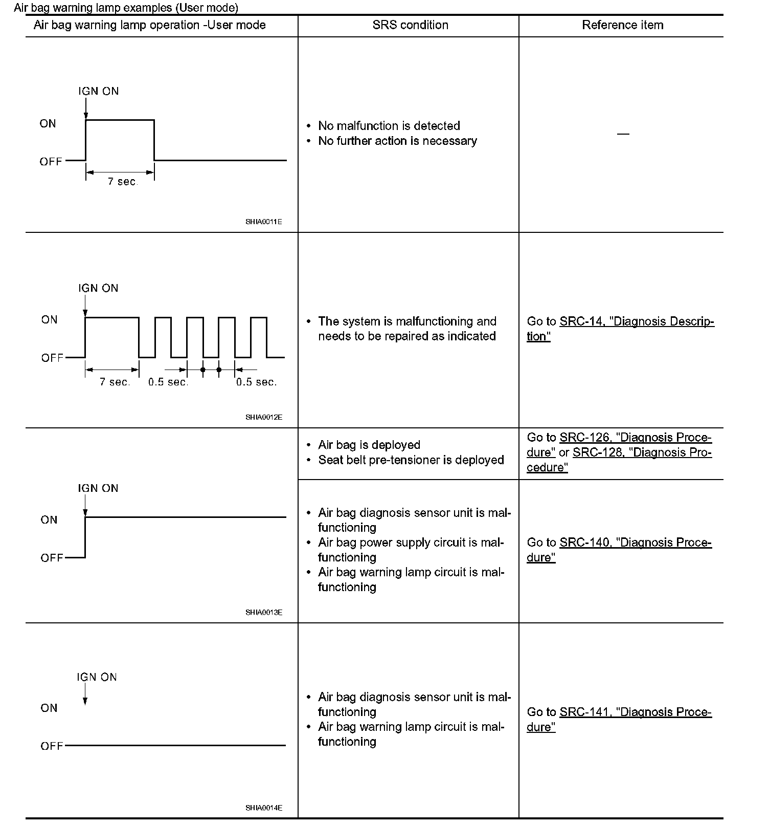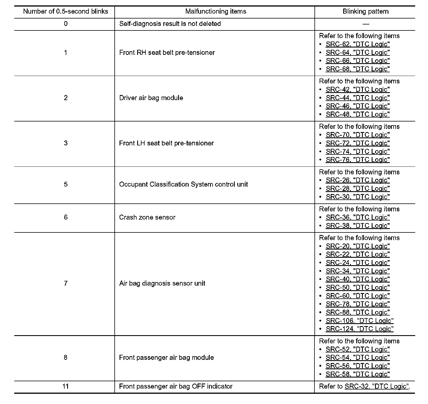 2. There are 2 blinking patterns for the air bag warning lamp. One is a 3-second blink followed by a 0.5- second blink repeated. The other is two 1.5-second blinks followed by a 0.5-second blink repeated.