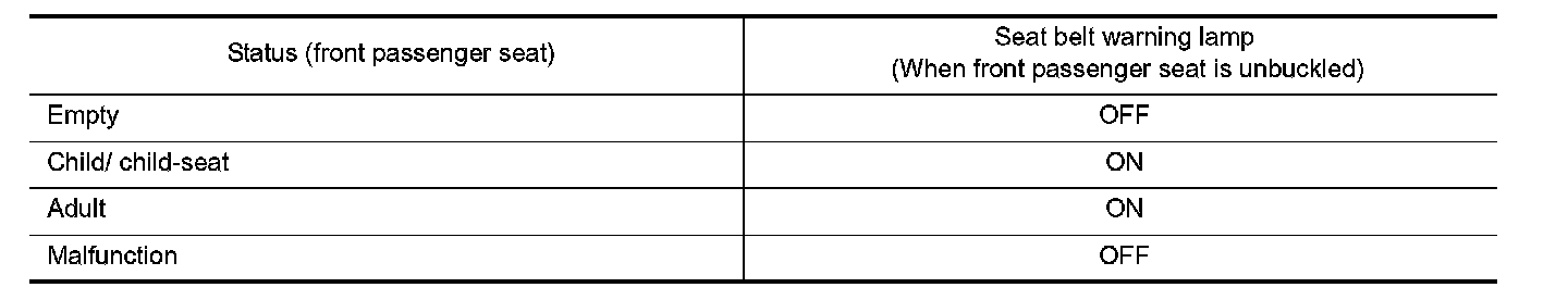 - Turns ON seat belt warning lamp, when the Occupant Classification System judges adult or child in the front passenger seat and the passenger seat belt buckle switch is OFF.
