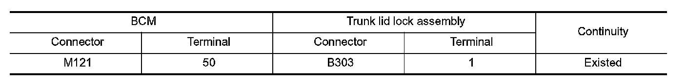 2. Check continuity between BCM harness connector and trunk lid lock assembly harness connector.