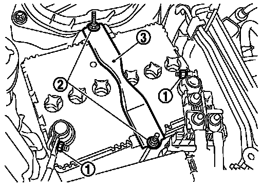 6. Remove battery fix frame mounting nuts (2) and battery fix frame (3).