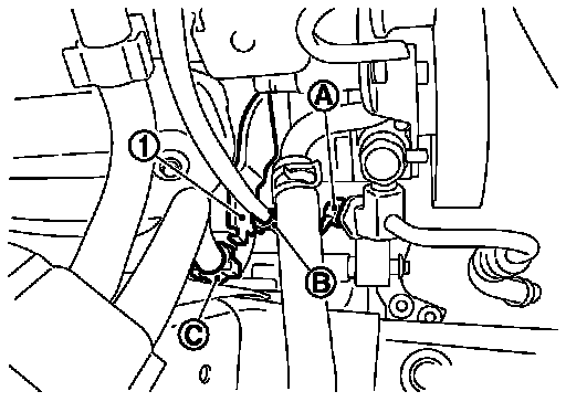 3. Remove the clip (B) from the harness bracket (1) and "B" terminal harness from the clip (C).