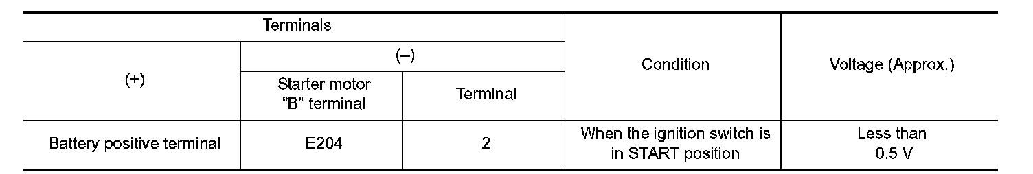 2. Check voltage between battery positive terminal and starter motor "B" terminal.