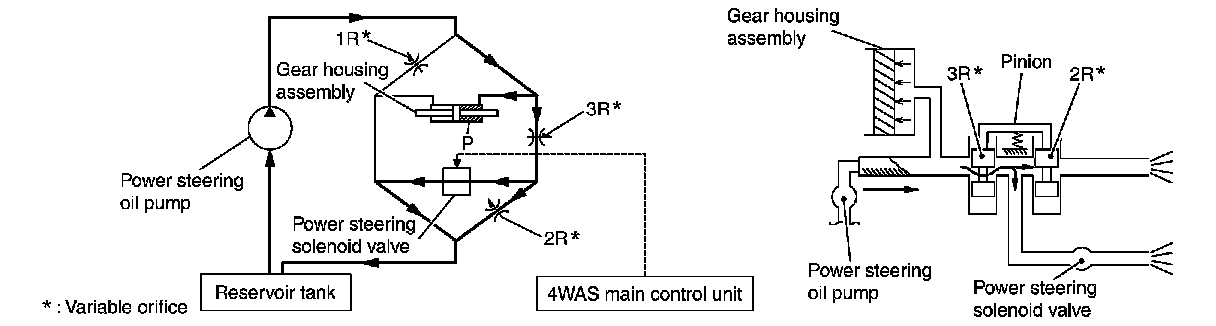 4. Oil pressure "P" in the gear housing assembly includes only oil pressure occurring in "3R" and results in a heavy steering force.