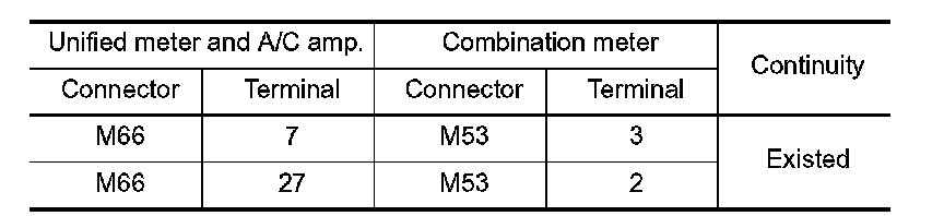 4. Check the continuity between the unified meter and A/C amp. harness connector and the combination meter harness connector terminal.