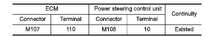 4. Check the continuity between ECM harness connector and power steering control unit harness connector.