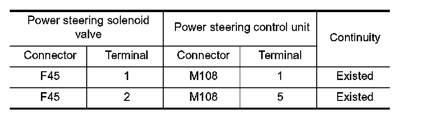 4. Check the continuity between power steering solenoid valve harness connector and the power steering control unit harness connector.
