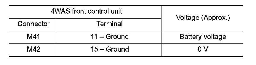 5. Check the voltage between 4WAS front control unit harness connectors and the ground.