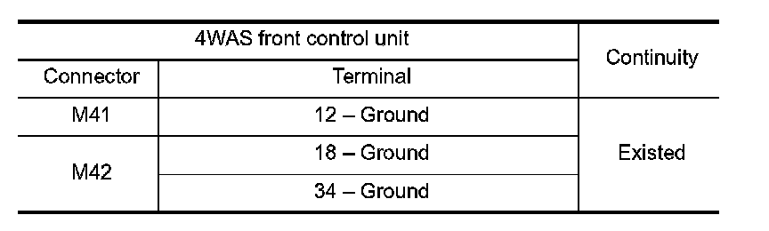 Check the continuity between 4WAS front control unit harness connector and the ground.