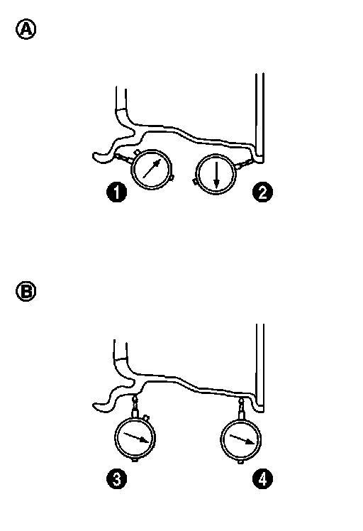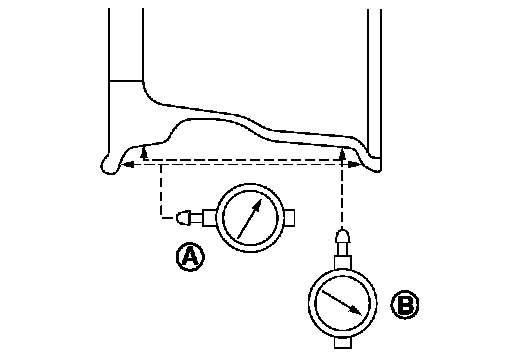 c. If the lateral deflection (A) or vertical deflection (B) for radial runout value exceeds the limit, replace aluminum wheel.
