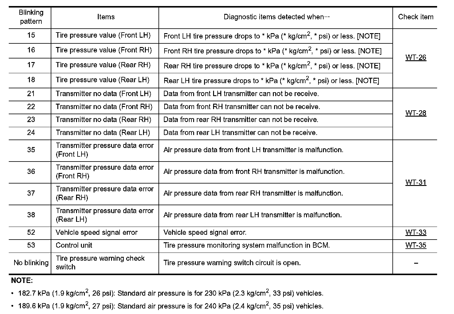 During driving, the TPMS receives the signal transmitted from the transmitter installed in each wheel, when the tire pressure becomes low. The control unit (BCM) of this system has pressure judgment and trouble diagnosis functions.