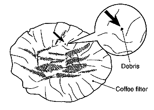 a. If small metal debris less than 1 mm (0.040 in) in size or metal powder is found in the coffee filter, this is normal. If normal debris is found, the A/T fluid cooler/radiator can be re-used and the procedure is ended.