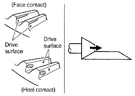 - If the tooth contact is near the face (face contact), or near the heel (heel contact), thicken pinion height adjusting washers to move drive pinion closer to drive gear.