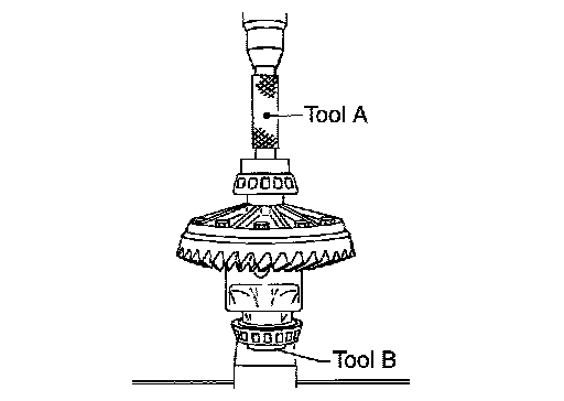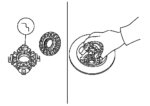 b. Measure the clearance between right side gear back and differential case using feeler gauge, while rotating right side gear with a suitable tool attached to splines.