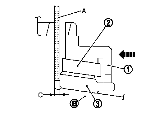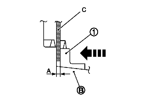 Measure the clearance "A" when pressing the baulk ring (1) against the cone (B) of clutch gear by hands at 2 points or more on the opposite side using a feeler gauge (C), and then calculate the mean value. Replace if outside the limit value.