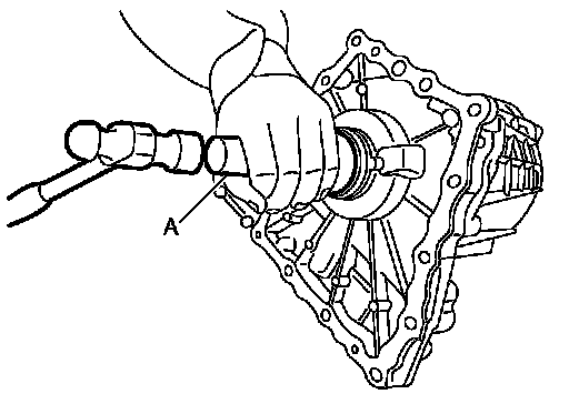 25. Apply transfer fluid to outside of main shaft oil seal, and install main shaft oil seal until it is flush with the end face of front case with the drift (A) [SST: ST30720000 (J-25405)].