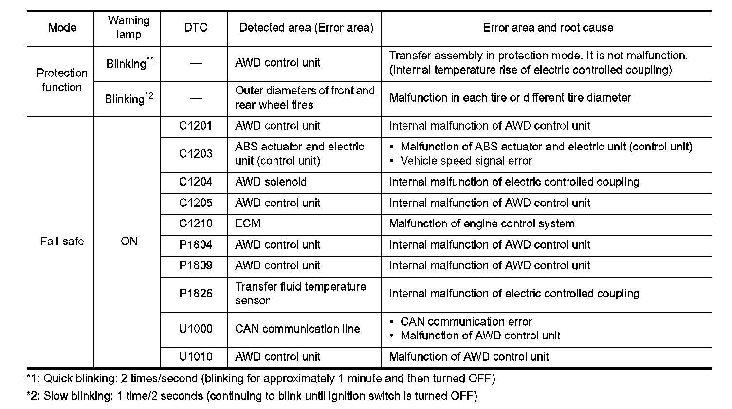 - When AWD warning lamp is ON, vehicle changes to rear-wheel drive or shifts to 4-wheel drive (front-wheels still have some driving torque).