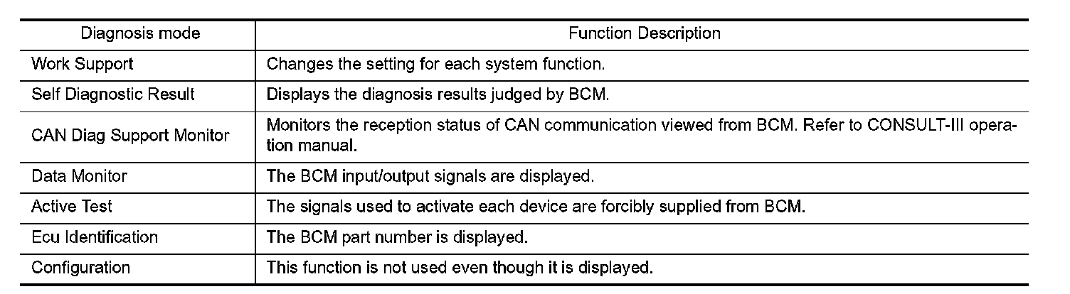 CONSULT-III performs the following functions via CAN communication with BCM.