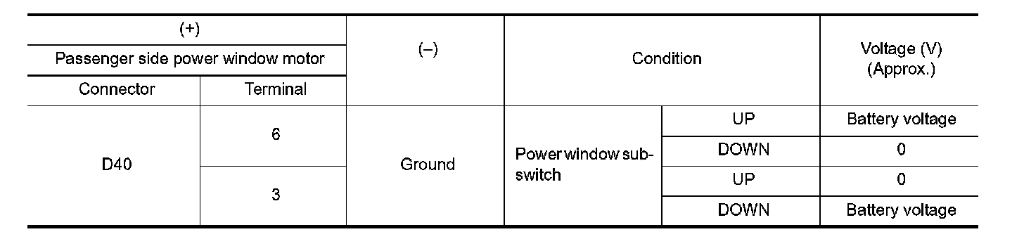 4. Check voltage between passenger side power window motor harness connector and ground.