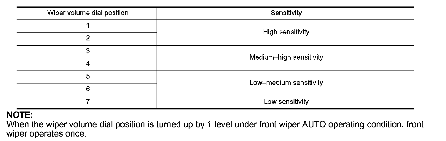 BCM determines rain sensor sensitivity according to wiper volume dial position.