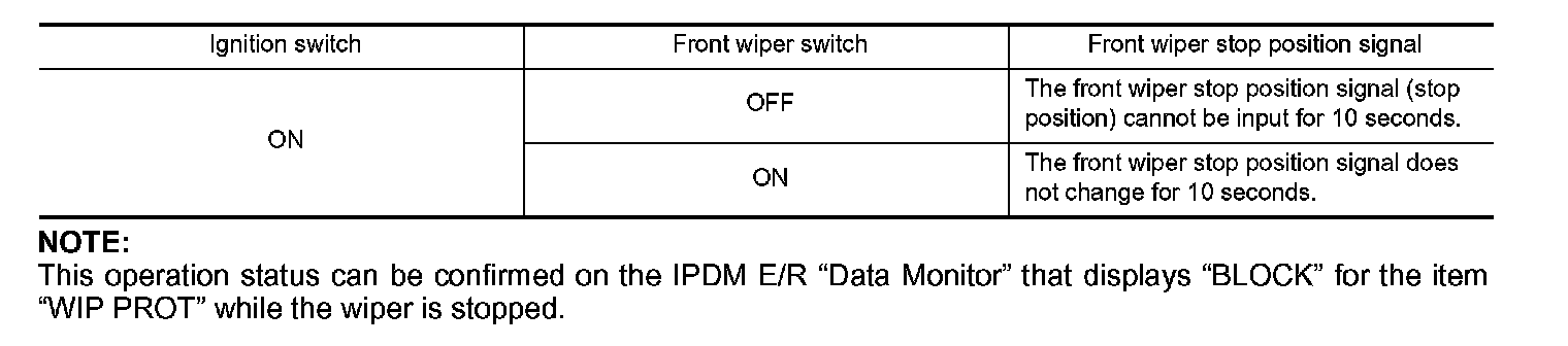When a front wiper stop position signal is in the conditions listed below, IPDM E/R stops power supply to wiper after repeating a front wiper 10 seconds activation and 20 seconds stop five times.