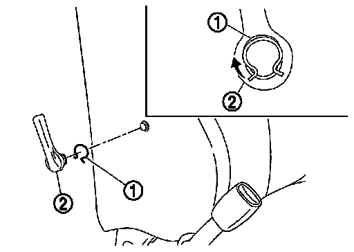 Pull snap ring (1) upward, and remove lumbar support lever knob (2) from seatback frame.Using a hook and pick tool.
