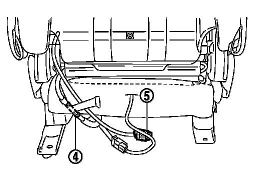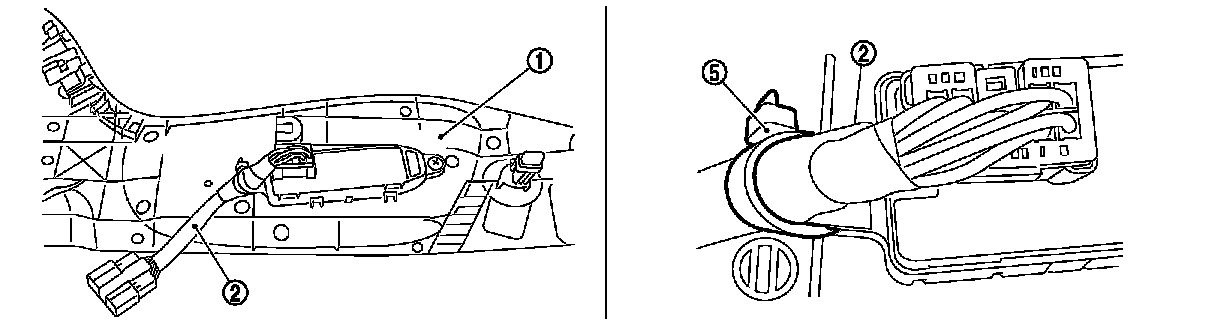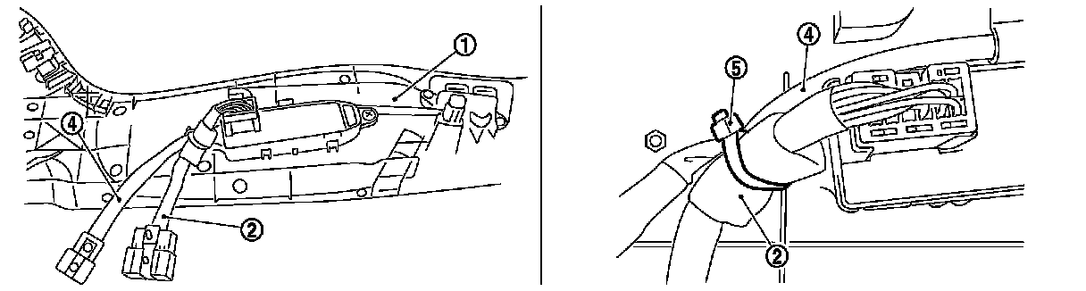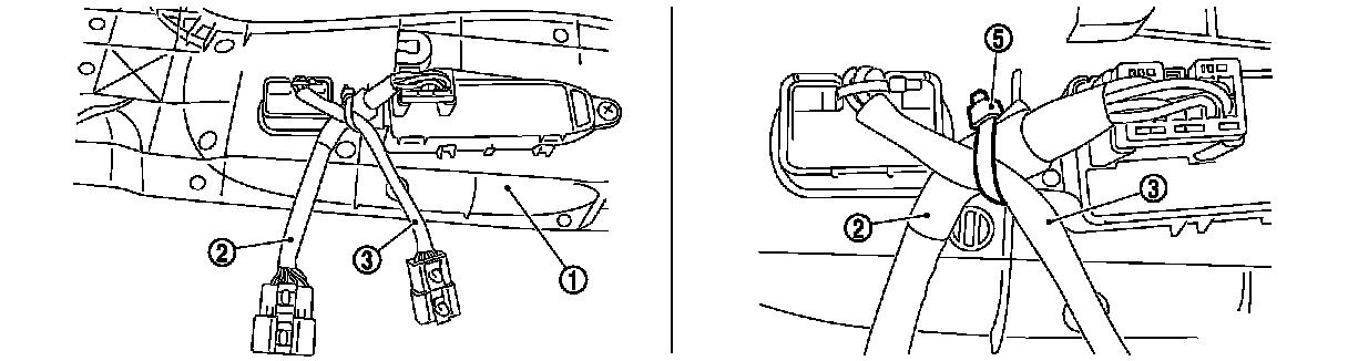 Locate lumbar support switch harness (3) in the forehand position, cross seat control harness (2), and fix to seat cushion outer finisher (1) boss using a self locking band (5) as shown in the figure.